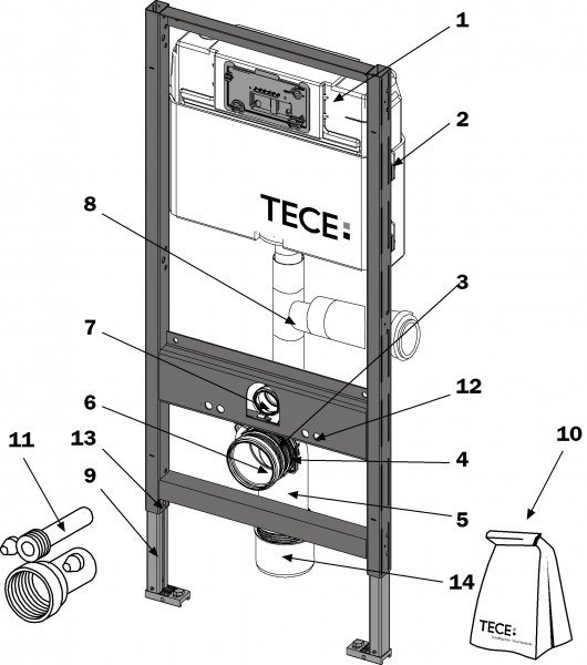 1) Зливний патрубок Tece TECEprofil з відведенням для підключення до вентиляції DN 70 відведення вліво 90°