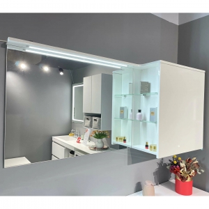 Дзеркало виготовлено з високоякісних матеріалів та обладнано підсвіткой та сенсором дотику. Дзеркальна шафа дозволяє зберігати дуже важливі та потрібні дрібнички та при цьому зберегти свій простір у ванні кімнаті.