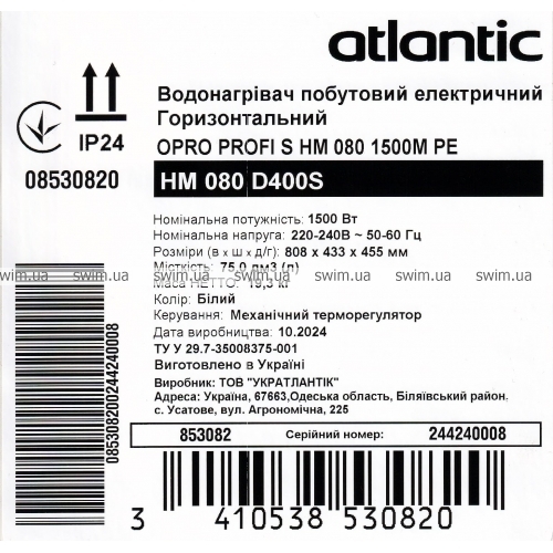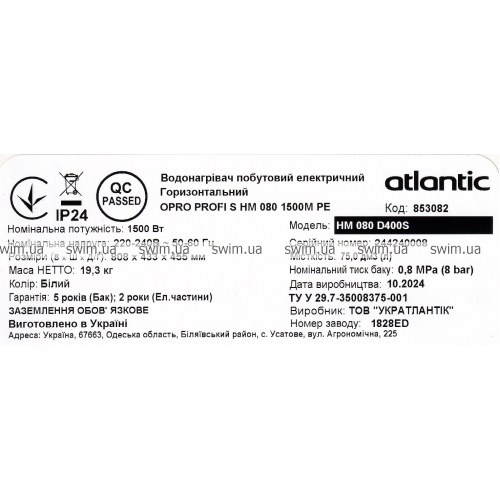 Водонагрівач побутовий електричний Atlantic Opro Horizontal HM 080 D400S (1500W) 853082