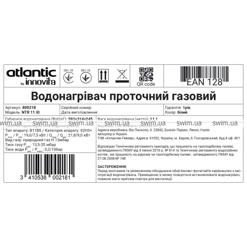 Водонагрівач проточний газовий Atlantic by Innovita NTR 11 iD 800218