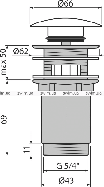 Водослив для умывальника click/clack 5/4", цельнометаллический с малой заглушкой для умывальников с переливом.