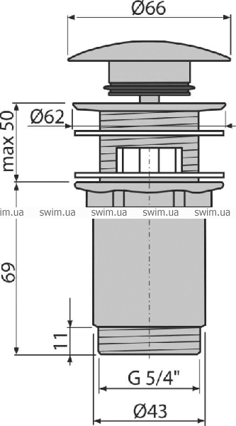 A392C - Донный клапан сифона для умывальника CLICK/CLACK 5/4", цельнометаллический с переливом и большой заглушкой