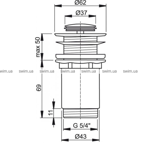 Водослив для умывальника click/clack 5/4", цельнометаллический с малой заглушкой для умывальников без перелива, для пластиковых и стеклянных умывальников.