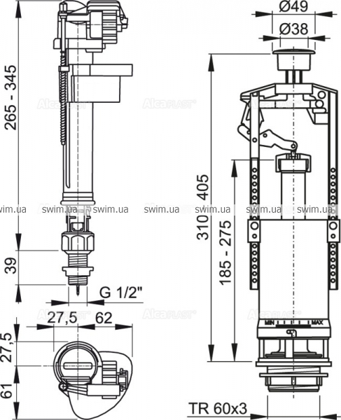 - Конструкция позволяет регулировать высоту механизма в зависимости от высоты бачка