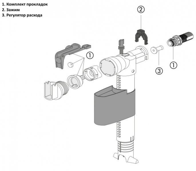 Запасные части к универсальному наполнительному клапану Sanit 510: комплект прокладок, зажим и регулятор расхода воды