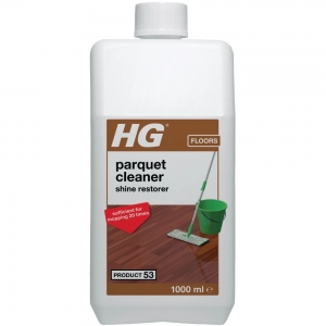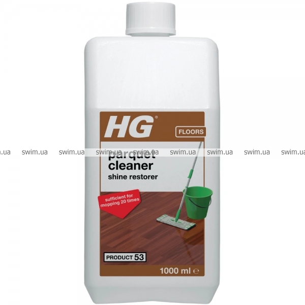 Миючий засіб для паркету HG – має приємний аромат, високу концентрацію, забезпечує ефект відновлення блиску. Для регулярного очищення лакованого паркету, а також паркетної підлоги, оброблених засобом поліролей для паркету HG або іншими поліролями. 1 л засобу вистачає на 20 застосувань.