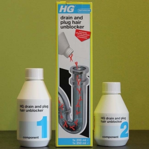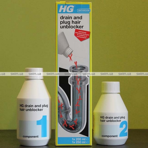 Засіб для усунення засмічень в трубах HG посилено гідроксидом калію і, отже, швидше справляється з цією проблемою і повністю розчиняє волосся і всі речовини, які вони затримують.