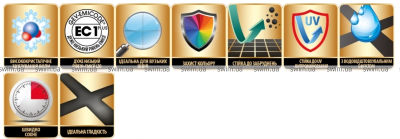 Підвищений захист від розвитку цвілі і мікроорганізмів, а також відсутність вапняних осадів забезпечують естетичний вигляд швів в приміщеннях і назовні, особливо в місцях, які знаходяться під впливом вологи. Завдяки ефекту відштовхування води, а також застосуванню технології Hydrodur® затирку відрізняє підвищена стійкість до проникнення води і забруднень. Можна застосовувати на терасах і балконах, теплих підлогах, а також для розшивки швів тонких плиток та плит (≤ 4 мм).