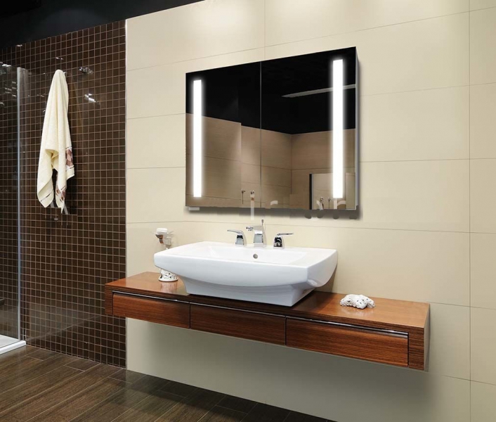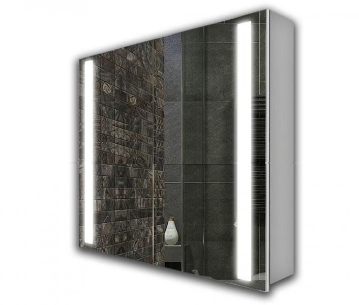 - Дверца шкафчика имеет толщину 19 мм. Обе поверхности дверцы являются зеркалами. Дверца может иметь встроенную LED подсветку, подогрев от запотевания, встроенные часы и увеличительную линзу.