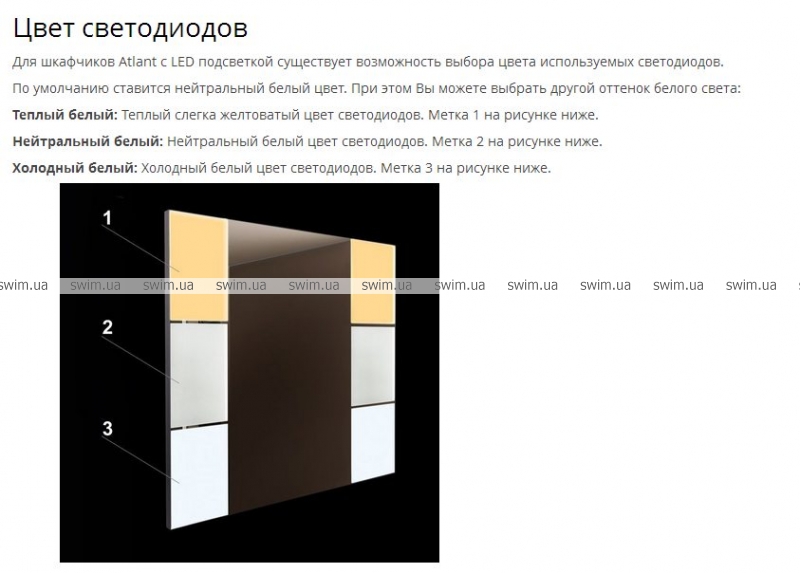 - Для шкафчиков Atlant с LED подсветкой существует возможность выбора цвета используемых светодиодов.