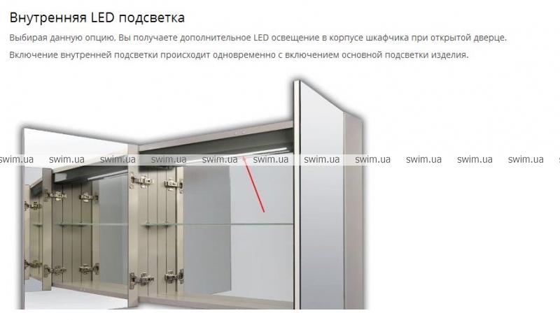 Подсветка встроена в дверцу, толщина которой составляет 19 мм. Обе стороны дверцы и задняя стенка внутри шкафчика являются зеркалами. Три зеркальных поверхности - это очень удобно и очень красиво!