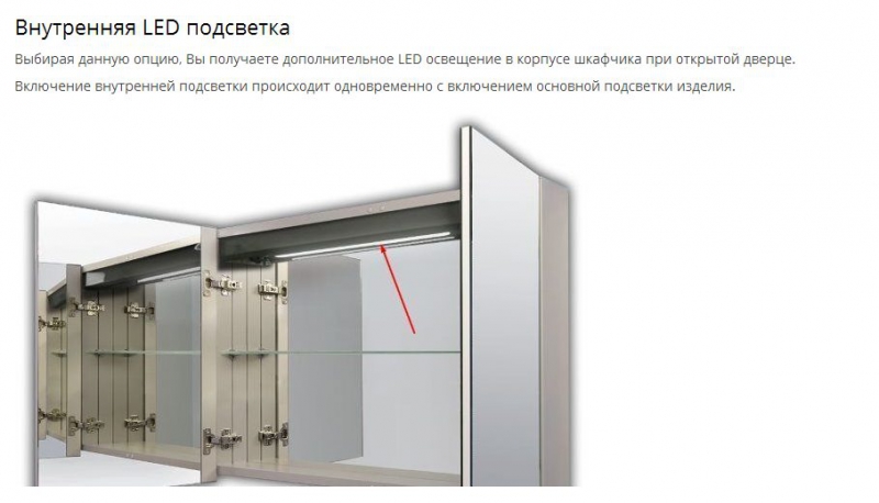 Подсветка встроена в дверцу, толщина которой составляет 19 мм. Обе стороны дверцы и задняя стенка внутри шкафчика являются зеркалами. Три зеркальных поверхности - это очень удобно и очень красиво!