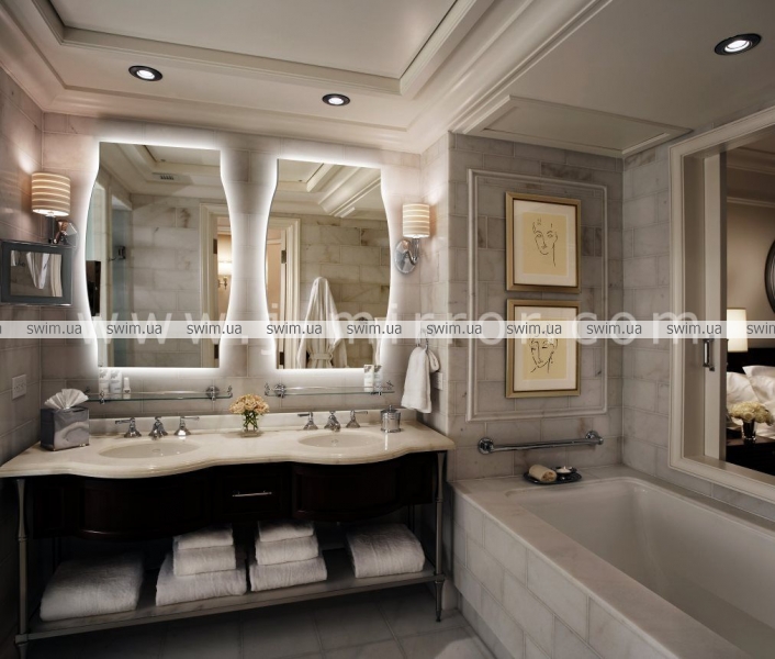Зеркало Ambra с контурной подсветкой амбилайт. Подсветка исходит с обратной стороны зеркала, красиво освещая помещение мягким свечением.