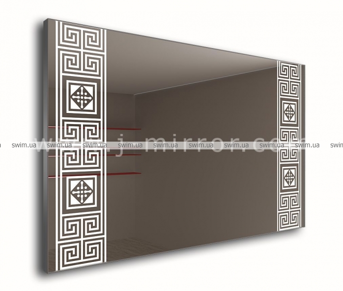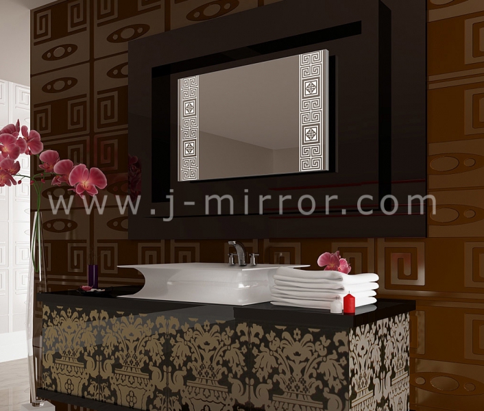 Зеркало со светодиодной подсветкой Dionisia. В зеркале гармонично сочетаются классический греческий орнамент и современная технология LED подсветки. Орнамент равномерно светится на зеркальной поверхности. Края зеркала защищены профилем из анодированного алюминия. Зеркало отвечает стандарту IP44.