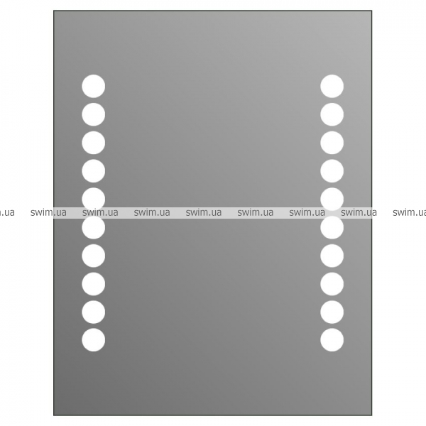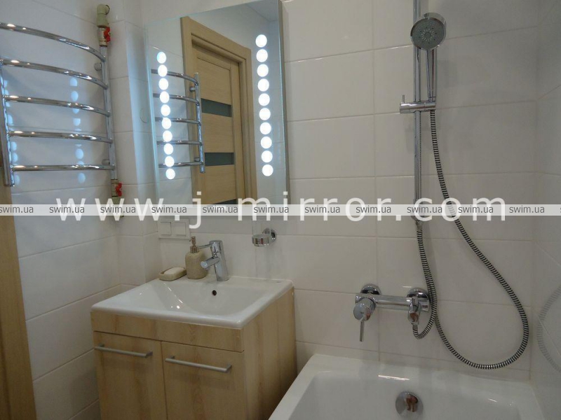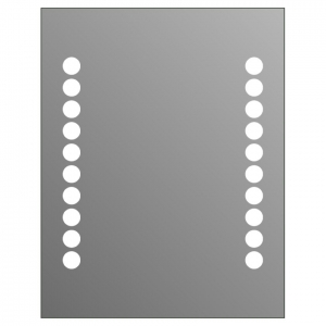 Зеркало для ванной с подсветкой mLt 012. Длина световых элементов – 480 мм. Элегантный узор из ряда кружков ярко освещен люминесцентными лампами T5 с длительным сроком службы. Зеркало отвечает стандарту защиты от влаги IP44. Несущая рама из анодированного алюминия по периметру подчеркивает современный стиль high-tech зеркала. Зеркало можно установить на стене вертикально или горизонтально.