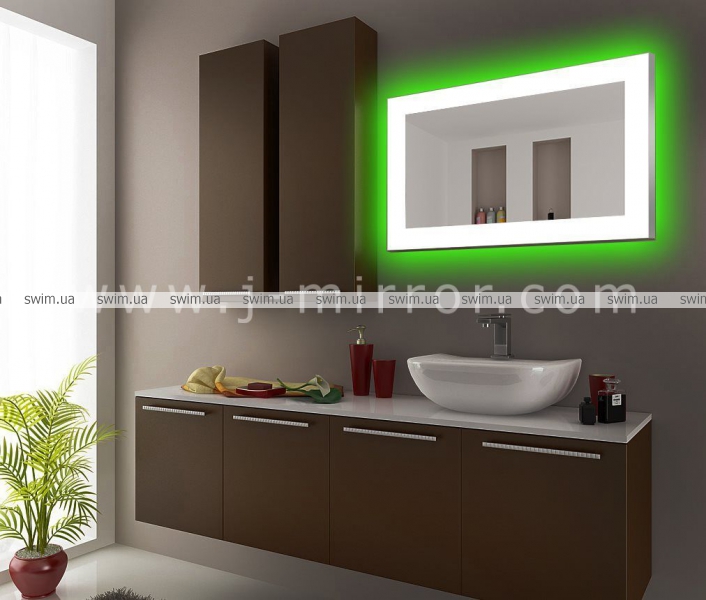 Зеркало Norma с LED подсветкой и дополнительной контурной RGB подсветкой. Современный стиль и современная технология. Световая полоса по периметру зеркала равномерно светится. Дизайн подчеркивается анодированным алюминиевым профилем, который защищает края зеркала.