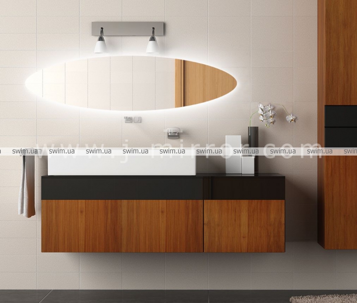 Зеркало Odetta с контурной подсветкой амбилайт. Подсветка исходит с обратной стороны зеркала, красиво освещая помещение мягким свечением.