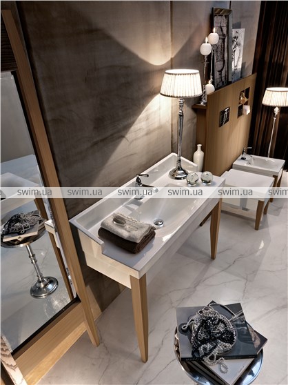 Отличительным элементом коллекции Benley это наличие деревянных ножек у раковин, мебели, ванны, биде и унитаза. Да, даже у биде и унитаза. Такое можно увидеть впервые. Вторая особенность — специальные деревянные стенные панели, к которым может крепится санфаянс. Панели содержат дополнительные аксессуары в виде выдвигающихся шкафов и полочек. Они не только подчёркивают санфаянс, но и несут практическое значение, выступаю в роли мебели.