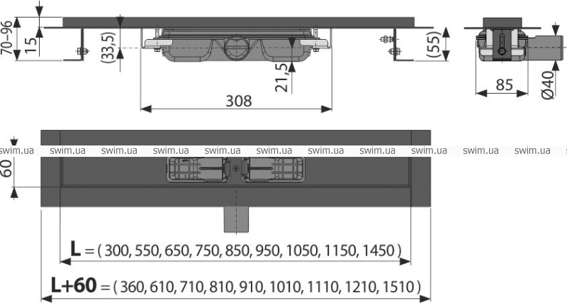 - Материал желоба: нержавеющая сталь 2 мм, AISI 304, DIN 1.4301 с покрытием черный-матовый