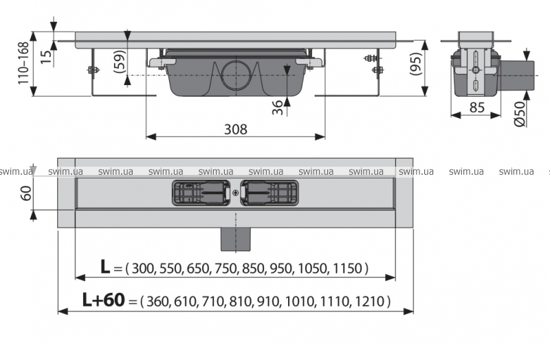 - Сифон: Расположение сифона по желанию Клиента. В зависимости от объема стока воды, можно использовать несколько сифонов в одном водоотводящем желобе.