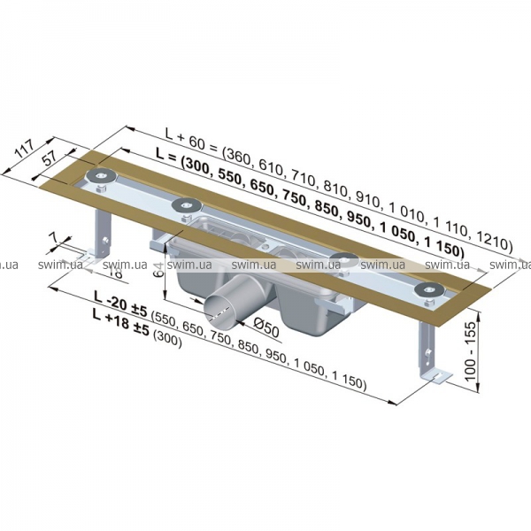 - Высота водоотводящих желобов вместе с сифоном 85 мм, диаметр сточной трубы 50 мм (подходит для новостроек).