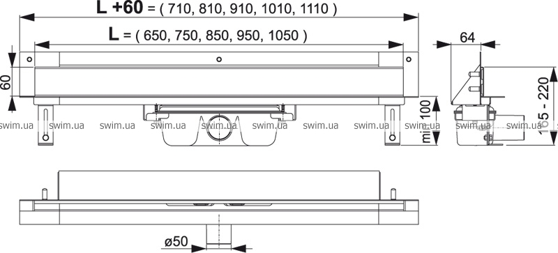 - Сифон: Расположение сифона по желанию Клиента. В зависимости от объема стока воды, можно использовать несколько сифонов в одном водоотводящем желобе.