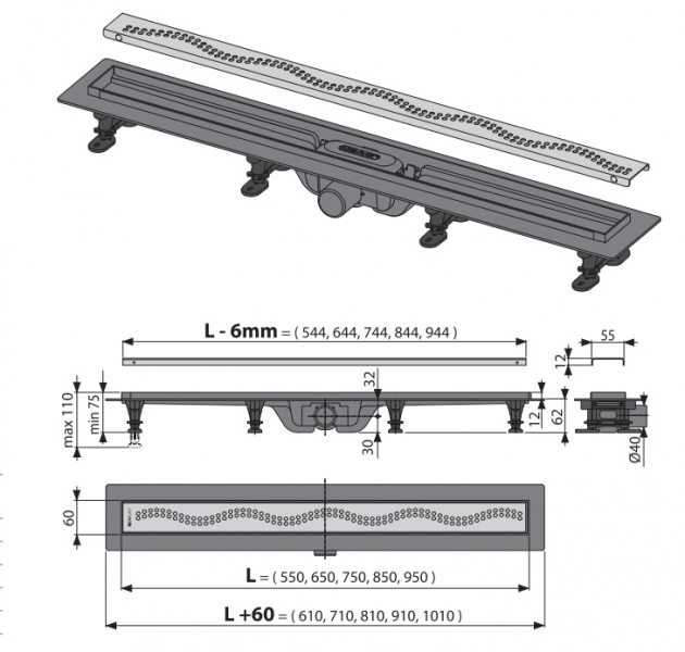 APZ8-850M Simple ВОДООТВОДЯЩИЙ ЖЕЛОБ С ПОРОГАМИ ДЛЯ ПЕРФОРИРОВАННОЙ РЕШЕТКИ
