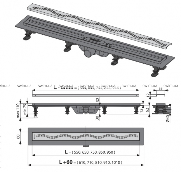 APZ8-950M Simple ВОДООТВОДЯЩИЙ ЖЕЛОБ С ПОРОГАМИ ДЛЯ ПЕРФОРИРОВАННОЙ РЕШЕТКИ