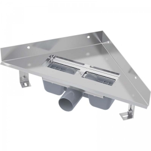 Желоб предназначен для установки исключительно в угол душевой, где стены имеют хорошую изоляцию. Вертикальный «воротник» обеспечивает простоту установки и превосходную изоляцию стен душевой. Желоб предназначен для установки массивных перфорированных решеток. Нержавеющий порог желоба образует визуальный переход между плиткой и вставленной решеткой. Вода протекает в желоб через края и отверстия желоба.