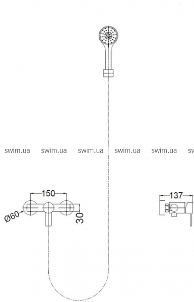 - Комплектується душовим гарнітуром: Однорежимна, кругла ручна лійка/Настінний, стаціонарний тримач для ручної лійки/Душовий шланг у металевому обплетенні з під'єднанням 1/2" x 1/2"