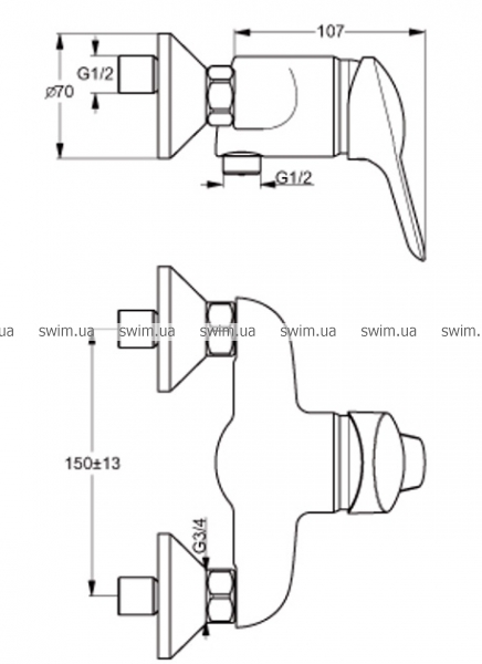 - Нижнє відведення для під'єднання душового шланга під діаметр 1/2"