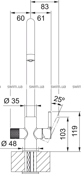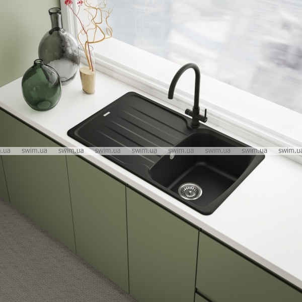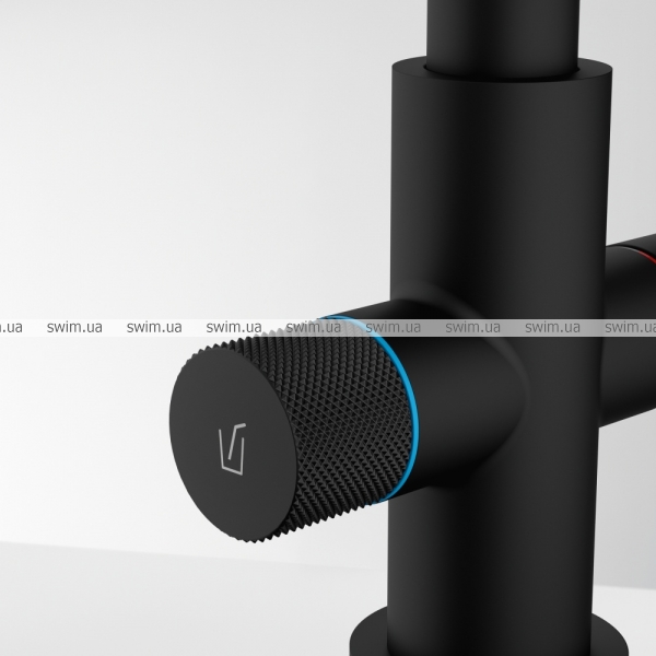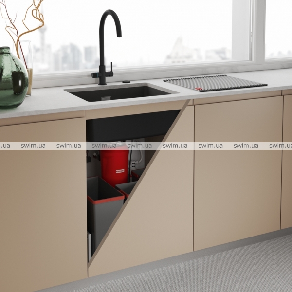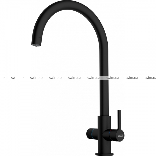 Змішувач з поворотним невитяжним виливом з під'єднанням до системи фільтрації води, в тому числі зі зворотним осмосом. Важіль відкривається вперед на кут 90°, тому можна здійснювати монтаж впритул до стіни. Кут повороту виливу складає, 360° тому водяний потік досягає більшої площі мийки, а також такий змішувач можна монтувати в острівні кухні. Аератор насичує водяний потік повітрям, завдяки чому краще працюють миючі засоби а також економиться вода.