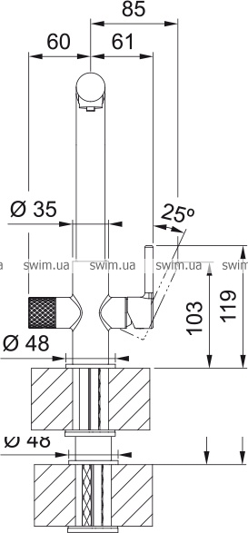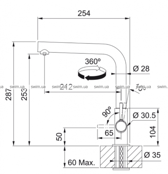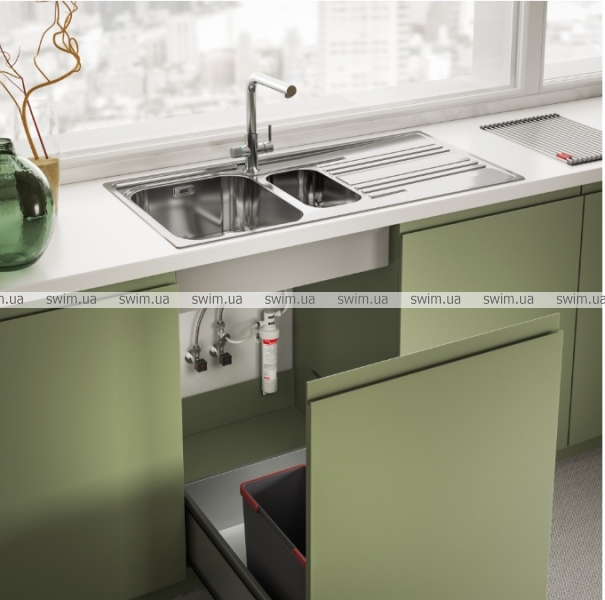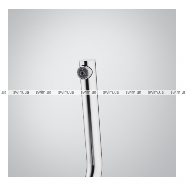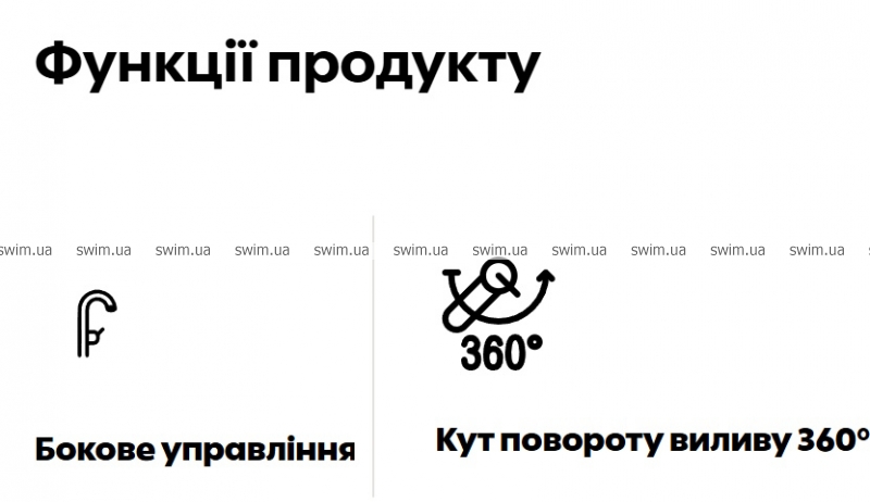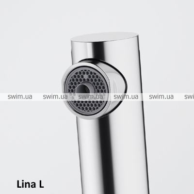 Змішувач з поворотним невитяжним виливом з під'єднанням до системи фільтрації води, в тому числі зі зворотним осмосом. Важіль відкривається вперед на кут 90°, тому можна здійснювати монтаж впритул до стіни. Кут повороту виливу складає, 360° тому водяний потік досягає більшої площі мийки, а також такий змішувач можна монтувати в острівні кухні. Аератор насичує водяний потік повітрям, завдяки чому краще працюють миючі засоби а також економиться вода.