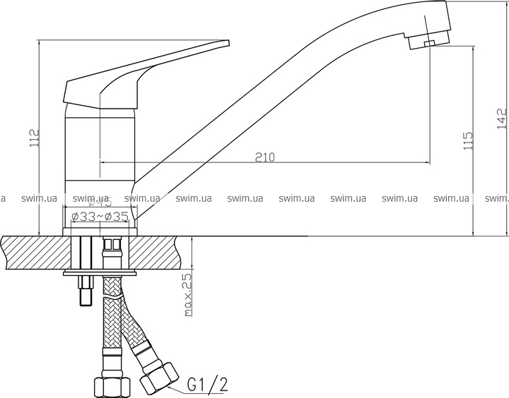 Представлений тут одноважільний, врізний кухонний змішувач SLS2125 серії Емшер від Silver, виготовлений із високоякісного металу з хромованим покриттям і має поворотний вилив з виносом в 21 см. Модель встановлюється на один отвір і комплектується гнучкими шлангами для підведення води під діаметр 1/2".