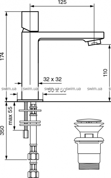 - Комплектація: гнучке підведення, донний клапан, кріплення, змішувач