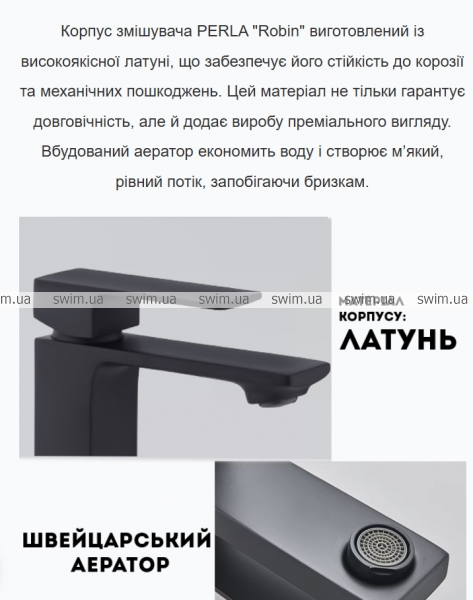 Чому PERLA "Robin" став справжнім хітом? Він гармонійно вписується в будь-який інтер’єр – від мінімалістичних ванних у скандинавському стилі до розкішних просторів із мармуровими поверхнями. Чотири кольорові варіанти дозволяють підібрати саме той відтінок, який ідеально доповнить вашу плитку, умивальник чи аксесуари. Наприклад, білий змішувач чудово виглядає в світлих інтер’єрах, створюючи відчуття чистоти і легкості, тоді як чорний додає драматичного контрасту і сучасного шику.