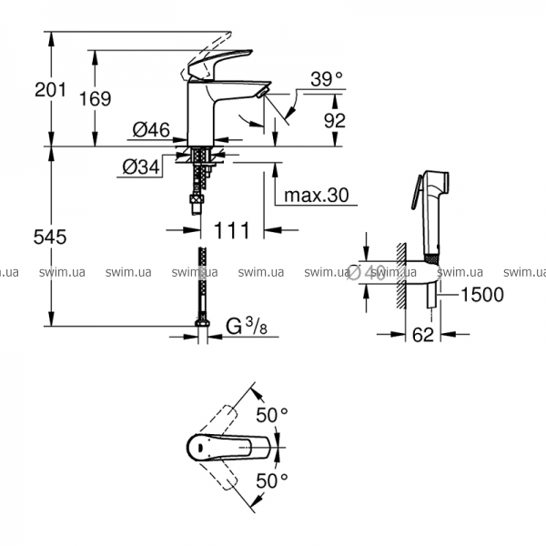 - Шланг гігієнічної лійки 1500 мм підключається до додаткового виведення із змішувача