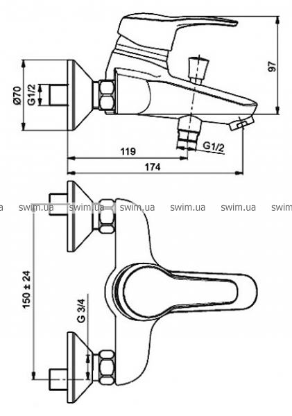 Настінний, одноважільний змішувач для ванни B8952AA серії Сева Лайт від Vidima виготовлений із високоякісного металу з хромованим покриттям, має стаціонарний вилив завдовжки 17.4 см, обладнується верхнім перемикачем ванна/душ, нижнім відведенням для під'єднання душового шланга під діаметр 1/2", і встановлюється на два отвори за допомогою ексцентрикового з'єднання під діаметр 1/2".